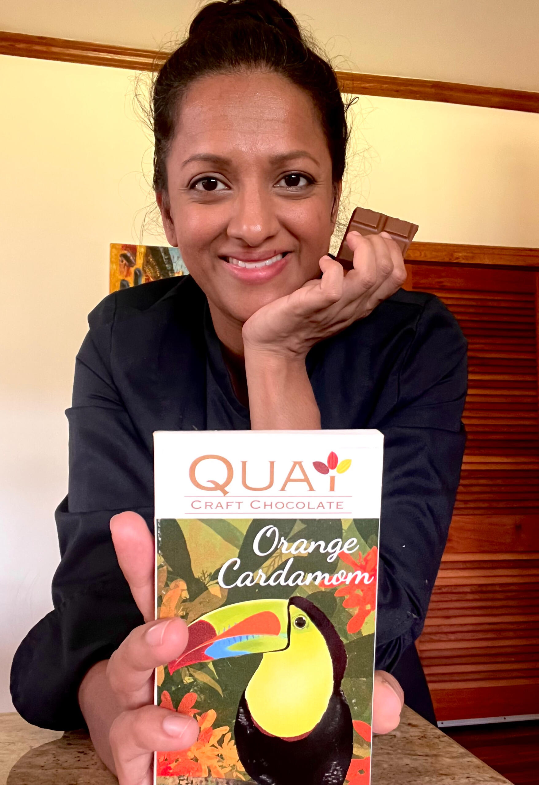 Hi! My name is Naiya and I am the founder of Quai Craft Chocolate.I have a degree in Chemistry from the University of Toronto and a diploma in cuisine and pastry from Gastronomicom International Culinary Academy in France. On returning from culinary school, I opened Scrumptious Sweets and Treats, a dessert catering company that allows me to display my creativity as a chef de patisserie by making beautiful, delicate European desserts with a tropical flair. I took a break from my dessert catering business when my daughter was born which gave me the opportunity to explore what I truly wanted to do- create a premium, locally made chocolate with cocoa beans grown in Guyana.Quai Craft Chocolate is my passion project based on a love for all things sweet, science and creativity. As such, I am involved in all aspects of Quai, including but not limited to- developing flavor profiles, making the chocolates, hand wrapping the individual bars, and drawing and creating the eye catching labels for the packaging. My goal is for Quai to stand amongst the best craft chocolates available regionally and internationally.I hope you enjoy the deliciousness that is Quai Craft Chocolate as much as I do!